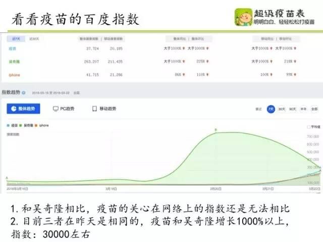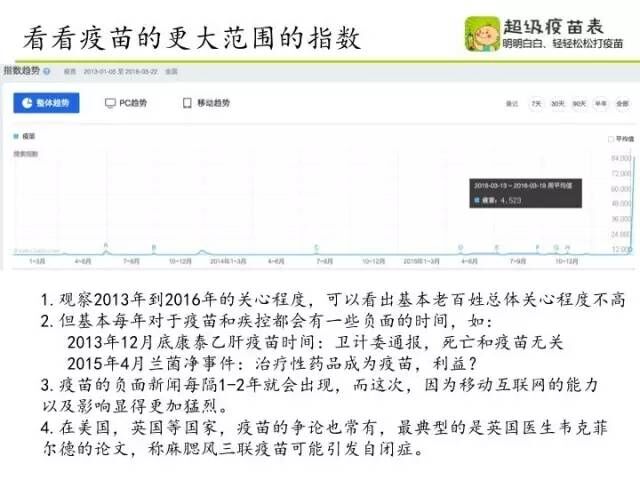 观察2013年到2016年大众对疫苗的关心程度,发现老百姓总体关心程度不高;但基本每年都会有一些对疫苗和疾控的负面报道,疫苗的负面新闻每隔1-2年就会出现一次,而随着互联网和移动互联网的普及,传播速度和范围也越来越大。