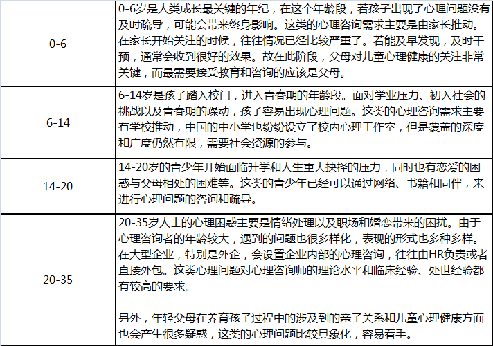 目前,对心理咨询接受度比较高的人群是中青年和儿童。按照人的生产发展周期,我把心理需求进行简单分类: