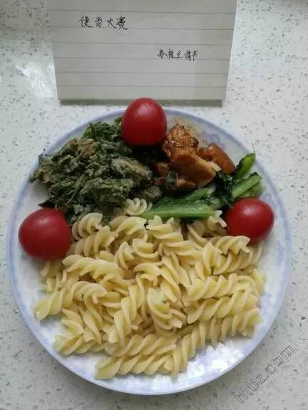 专家点评:意面的西餐口味确实可以调剂一下,只是有点硬,可能老年人用后胃会不太舒服,如果怕久煮升糖过高可以添加适量的燕麦片,绿叶菜是个不错的选择,但是圣女果放的太吝啬了吧,多放些些补充番茄红素抗氧化哦。