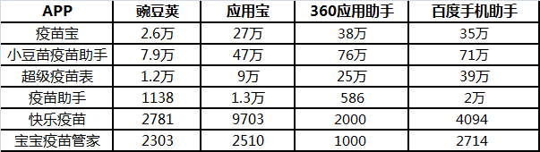 不过,目前大部分疫苗APP都围绕着在线预约接种和疫苗知识普及服务,还在疫苗的生产和物流环节以外,疫苗类的APP前三强的用户数量优势很明显,以最常用的android市场豌豆荚、应用宝、360应用助手和百度手机助手为例。