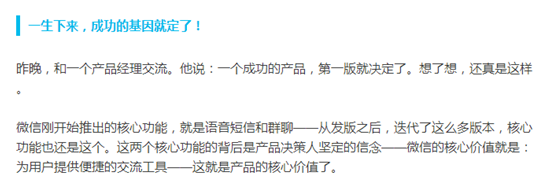 以上是锐哥文章中的逻辑,他认为一个好的产品“一生下来,成功的基因就定了”。但我完全不同意,因为互联网产品跟软件产品最大的区别,就是经常与用户交互,并且让用户参与产品设计,并不断进行快速迭代,不断重构的过程。从来没有一款互联网产品生下来就必然成功的,包括微信,其实也曾经历过一段困难时期,而成功却需要“天时地利人和”,缺一不可。微信并不是市场上第一个做IM的,包括QQ也是,锐哥认为微信坚持的“语音短信和群聊”是它的核心功能和价值。但是事实上所有的IM应用都坚持了语音短信和群聊。成功的产品是这样做的,但是并不是这样做的产品就能成功。他将这两者关系弄反了,这是基本的商业逻辑错误。