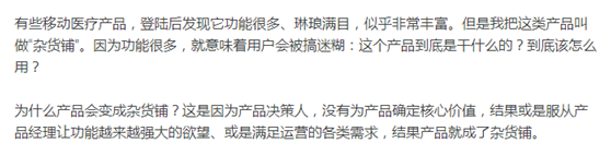 从另一个角度来说,锐哥觉得一些移动医疗平台功能很多,琳琅满目,像杂货铺,用户上去后不知道要干些什么。所以他认为单一功能定点爆破是最对最好的方式,并且用自己医生站的数据证明了这个想法。这确实有一定道理,特别在初创期,但是这一点也恰恰反映出了锐哥的医学背景是比较浅的,而过强的功利心可能导致企业成长的天花板。