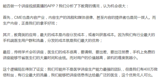 锐哥说的观点的确是有一定道理的。他们通过数据驱动运营看到产品的真实需求,而且是移动互联技术带来的便捷可能和低成本,还正好赶上直播这一风口,因此医生站产品起来得很快,经过非常强的病毒营销宣传,配合医学界微信的巨大流量优势,然后在运营中以红包,有奖和搞各种各样的活动来诱导分享。通过这一套成熟的运营方式,产品快速聚粉,然后让他们在IM系统里面聊天交互后进一步沉淀。