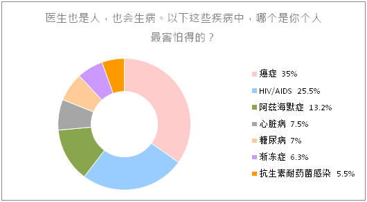 在这次调查中我们可以发现,三分之一的医生最害怕得的疾病是癌症,四分之一的医生害怕的是艾滋病,因为这两个疾病都是病情发展迅猛且并没有特效治愈药的疾病,另有7.5%的医生害怕的是心脏病,7%的医生害怕的是糖尿病,因为这两个疾病是对生活有一定影响,但采取有效治疗手段是可以提高生存质量的。剩下6.3%的医生不愿得的疾病是渐冻症,5.5%的医生选择了抗生素耐药菌感染,这两个疾病虽然没有特效药但其本身发病概率比较低,所以只有一小部分医生对此有担忧。