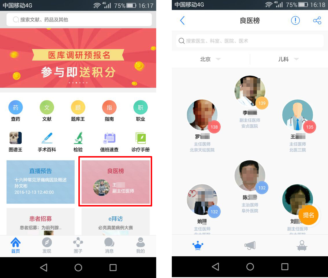 医库良医榜是以地域和学科双重划分,对其进行交叉评价,寻找医生相信的医生,并将其量化打分,由医疗同行点赞和留言评价,以及医生的职称和医术等得到不同的权重分数,还会推荐出不同地区同行最相信的学科和医院。