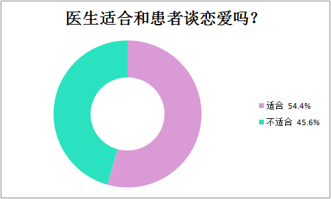 在这次调查中我们可以发现,对于医生是否适合和患者谈恋爱这个话题,有54.4%的医生赞同医生和患者谈恋爱,不赞同医生和患者谈恋爱的占45.6%,总体而言大家的观点各持一半,但觉得医患适合谈恋爱的相对占比多一些。