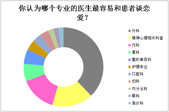 另外,我们还是调查了在医务工作者心目中“哪个专业的医生最容易和患者谈恋爱?”,结果显示外科医生被认为是最容易和患者谈恋爱的,而精神心理相关科室、内科的医生排名第二和第三,整形美容科和护理也是占很大比例被认为很容易和患者谈恋爱。
