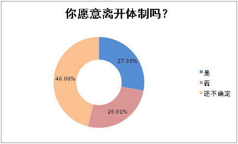 对于是否愿意离开体制,近一半的医务工作者表示不确定,26.01%的人是不愿意离开体制,而有27.93%的人愿意离开体制。