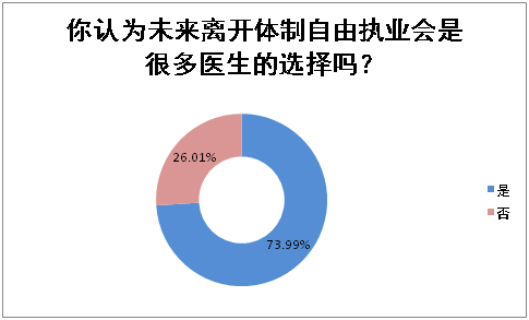 超七成的医务工作者并不认为未来离开体制自由执业会是很多医生的选择,只有少部分的人会认为离开体制后的医生会选择自由执业。