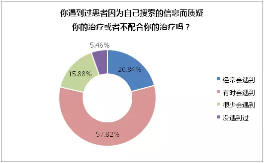 在参与调研的用户中,20.84%的医务工作者经常会遇到患者因网上搜索的信息而对诊断结果提出质疑或不配合治疗,57.82%的医务工作者有时会遇到,15.88%的医务工作者很少会遇到,剩下的5.46%则表示没有遇到过。