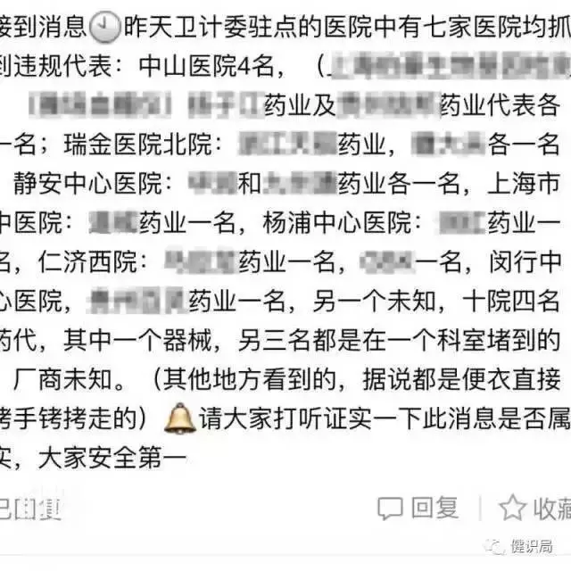 2016年圣诞夜,央视曝光了上海、湖南两地6家大型医院的“药品回扣门”事件,除了涉事的上海和湖南,全国其他各大省市医院也开展了严厉的药代整治活动,在矫枉过正的早期,又出现了给保安发奖金去逮医药代表的事情,导致全行业尊严全无!据未核实的报道,近日又在上海8家医院抓到了违规的医药代表,以下为相关报道显示图片: