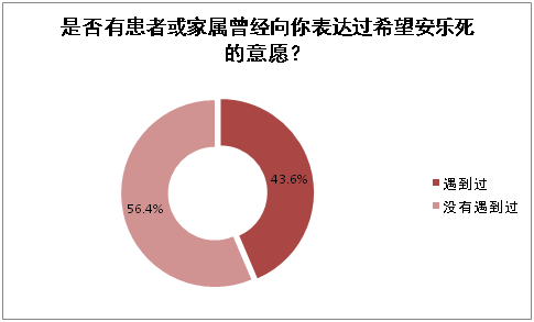 在平时临床工作中,有43.6%的医务工作者曾遇到过患者或者家属向自己表达过希望安乐死的意愿,有56.4%的医务工作者并没有遇到过这类情况。