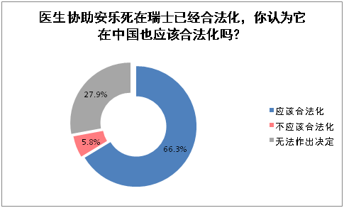 对于安乐死是否应该在中国合法化,66.3%的医务工作者表示应该合法化,5.8%的觉得不应该合法化,剩下的27.9%无法作出决定。