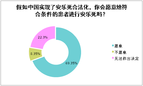 从我们的调研数据可以看出,69.35%的医务工作者表示在安乐死合法化的情况下,愿意给符合条件的患者进行安乐死,22.3%的医务工作者对这种情况无法作出决定,8.35%的医务工作者不愿意给患者进行安乐死。