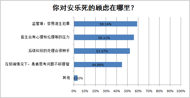 医务工作者对安乐死顾虑的地方有很多,其中“监管难,容易滋生犯罪”是最为让人担心的,而“医生会有心理和伦理等的压力”,“后续纠纷的处理会很棘手”,“在极端情况下,患者思考问题不够理智”这些问题也是很多医务工作者比较顾虑的。