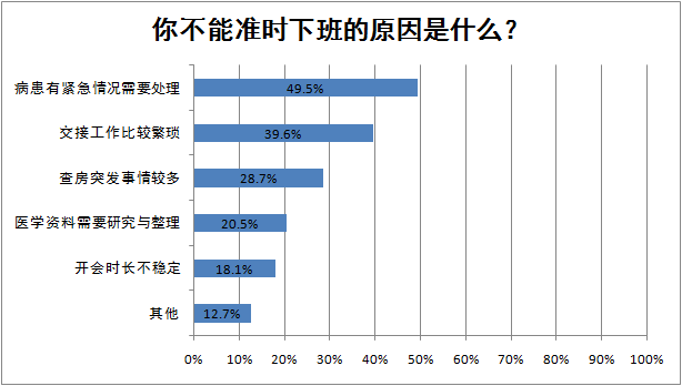一位来自山东滨州的住院医师说:“医疗交接,病号处理及观察,手术时等等都能造成不能准时下班。”