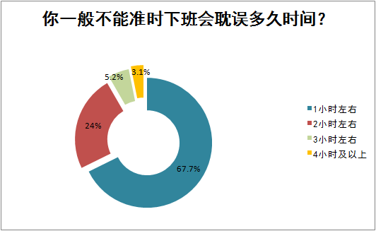 绝大多数的医务工作者下班一般会耽误1小时左右的时间,24%的医务工作者会耽误2小时左右,5.2%的人会耽误3小时左右,还有极少部分医生会耽误4小时及以上的时间下班。