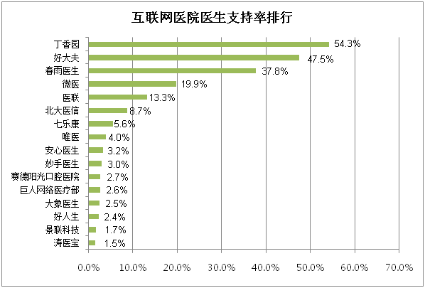 从调研结果可以看出,在医生们心目中,丁香园互联网医院支持率最高,有超过一半的投票者(54.3%)支持,好大夫和春雨医生分别排名第二和第三。其次,微医和医联也有不少支持者,支持率分别为19.9%和13.3%。除此之外,其余互联网医院的支持率都在10%以下。
