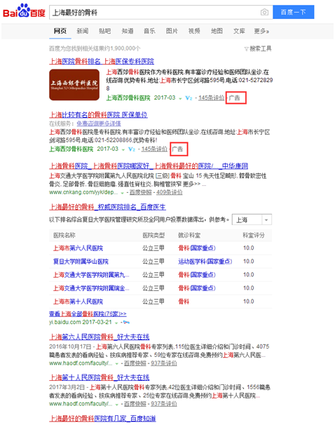 举个例子,假设想在上海看骨科疾病,在百度搜索关键词“上海最好的骨科”,会出现如下信息: