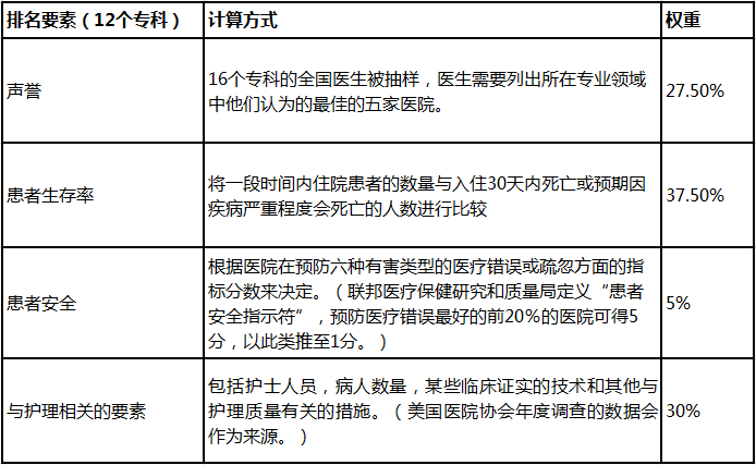 US news全美医院与专科排行榜评定方案