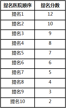 由每个专科医生提名其所在专科最专业的十家医院,并按照提名顺序为医院计算分数:
