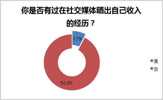 本次调研可以看出,绝大多数的医务工作者没有在社交媒体晒自己收入的经历,而有7.7%的医务工作者曾经在社交媒体上晒出过自己的收入。