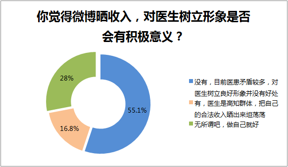 对于微博高调晒收入这种行为,有一半的医务工作者觉得医生是高知群体,把自己的合法收入晒出来坦荡荡。有16.8%的医务工作者认为目前医患矛盾较多,微博晒收入对医生树立良好形象并没有好处,而近三成的医务工作者觉得无所谓,做自己就好。