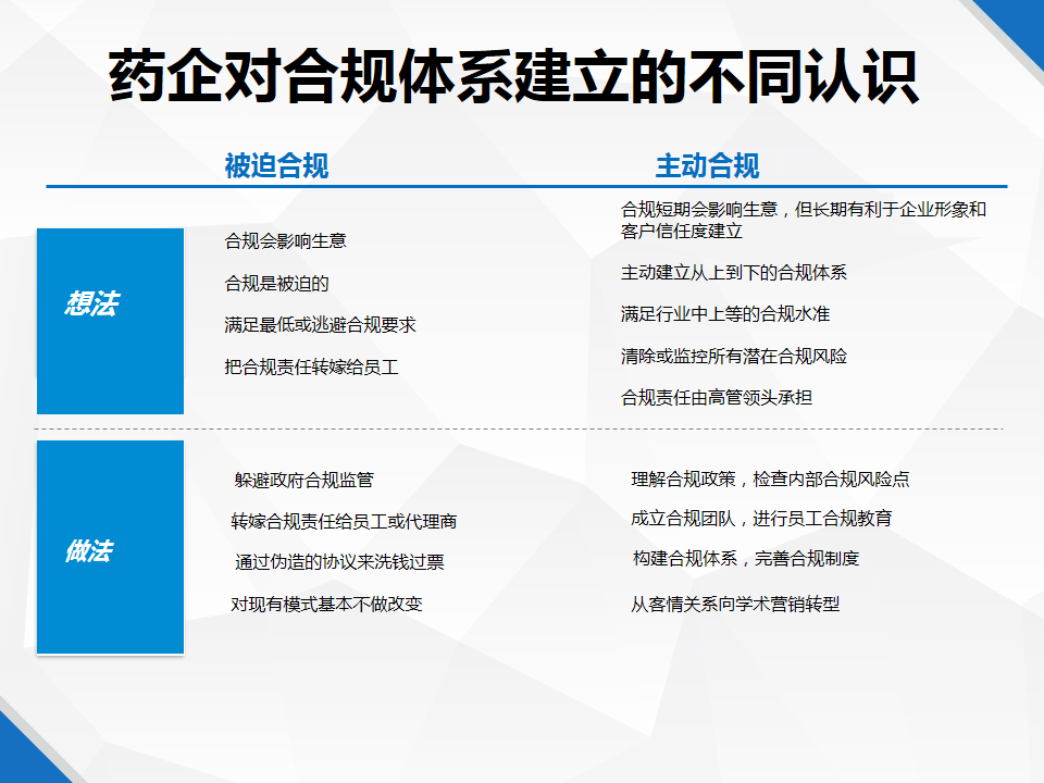 当前药企对合规体系有两种不同的认识,主动合规和被迫合规。一种认为合规限制的生意的发展,影响了市场,于是想尽各种办法,通过伪造协议、转嫁责任等方式躲避合规监管。主动合规的药企认为长期有利于企业形象和客户信任度建立,因此营销重心从客情关系向学术营销转型,构建合规体系,完善合规制度。