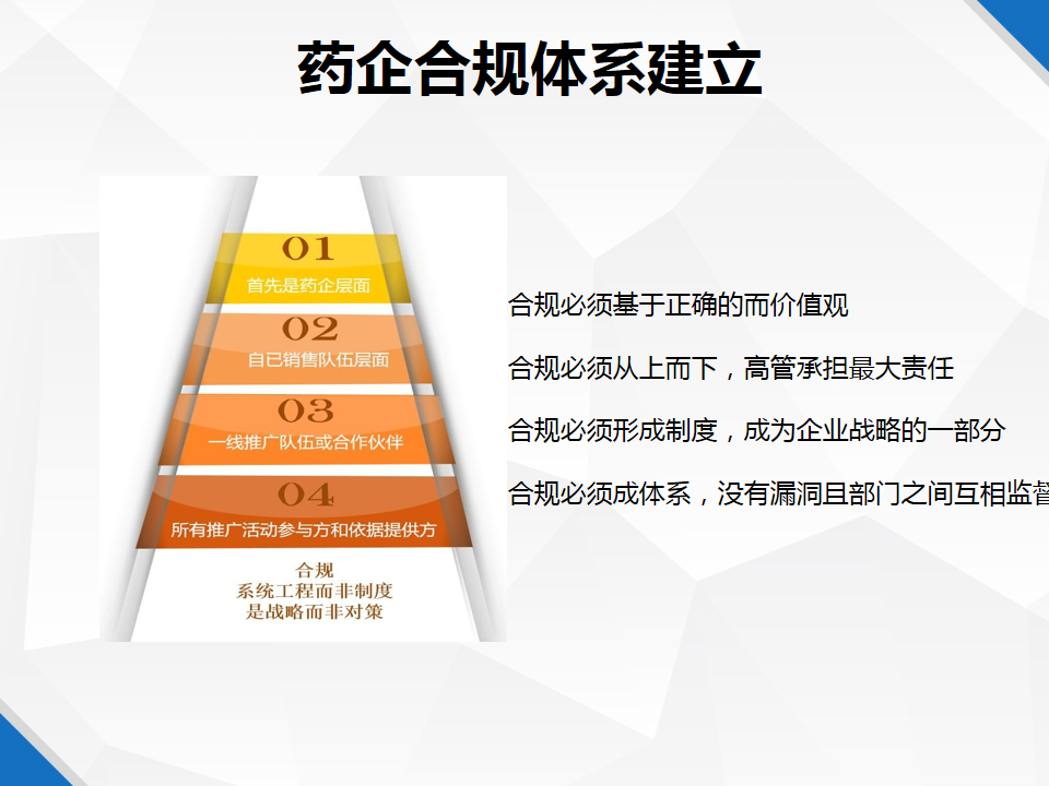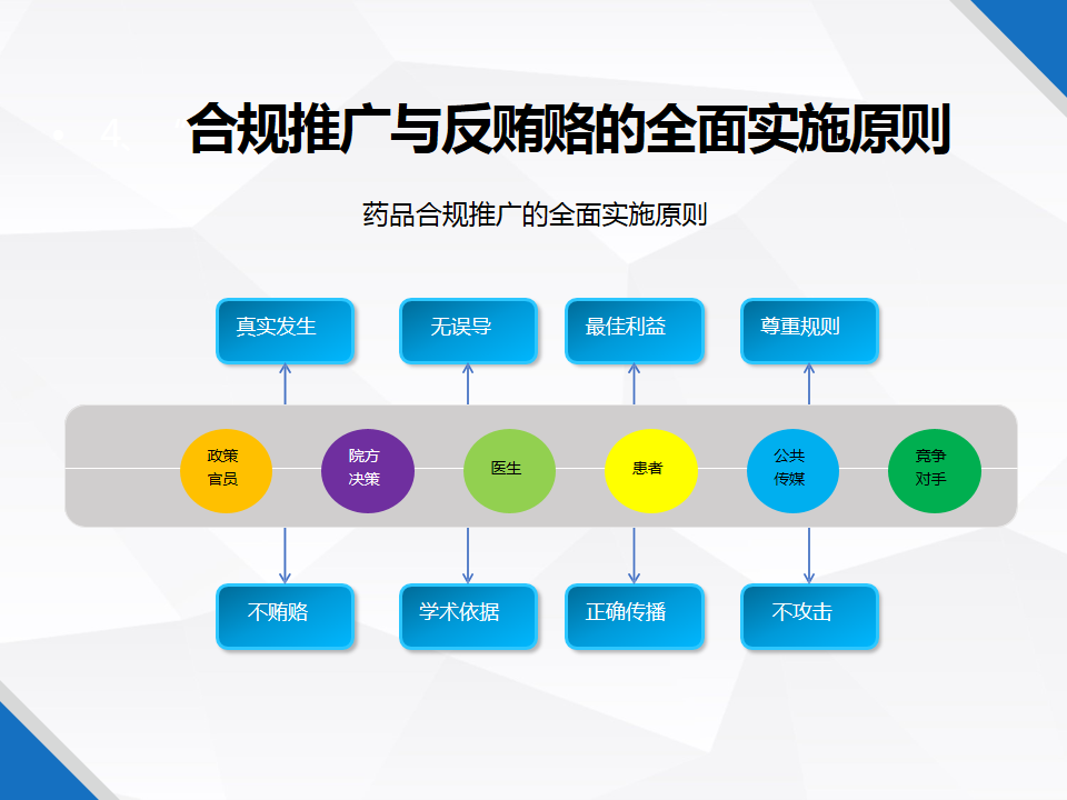 药品合规推广的全面实施原则,面向医院、医生、政府官员要遵循无误导、真实发生、学术依据、不贿赂的原则;对患者、公共传媒、竞争对手要以最佳立意、规则、正确传播、不攻击为重。