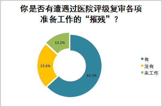 从我们的调研情况可以看到,有超过六成的医务工作者曾经遭遇过医院评级复审准备工作的“摧残”,而23.6%的人没有遇到过,可以看出医院评级复审困扰医护工作者工作的现象较普遍。