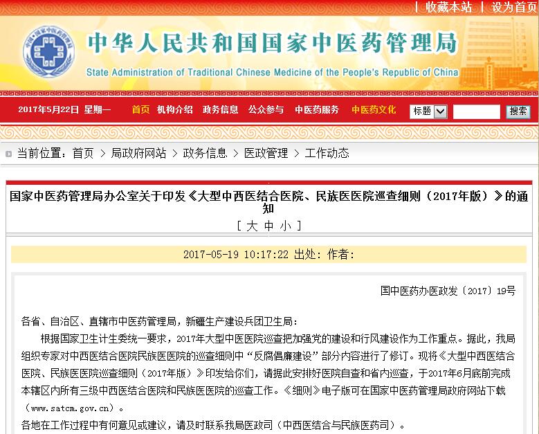 5月19日,国家中医药管理局办公室印发《大型中西医结合医院、民族医医院巡查细则(2017年版)》(下称细则)。这一举动,又为国家的医药反腐事业加上了重码!