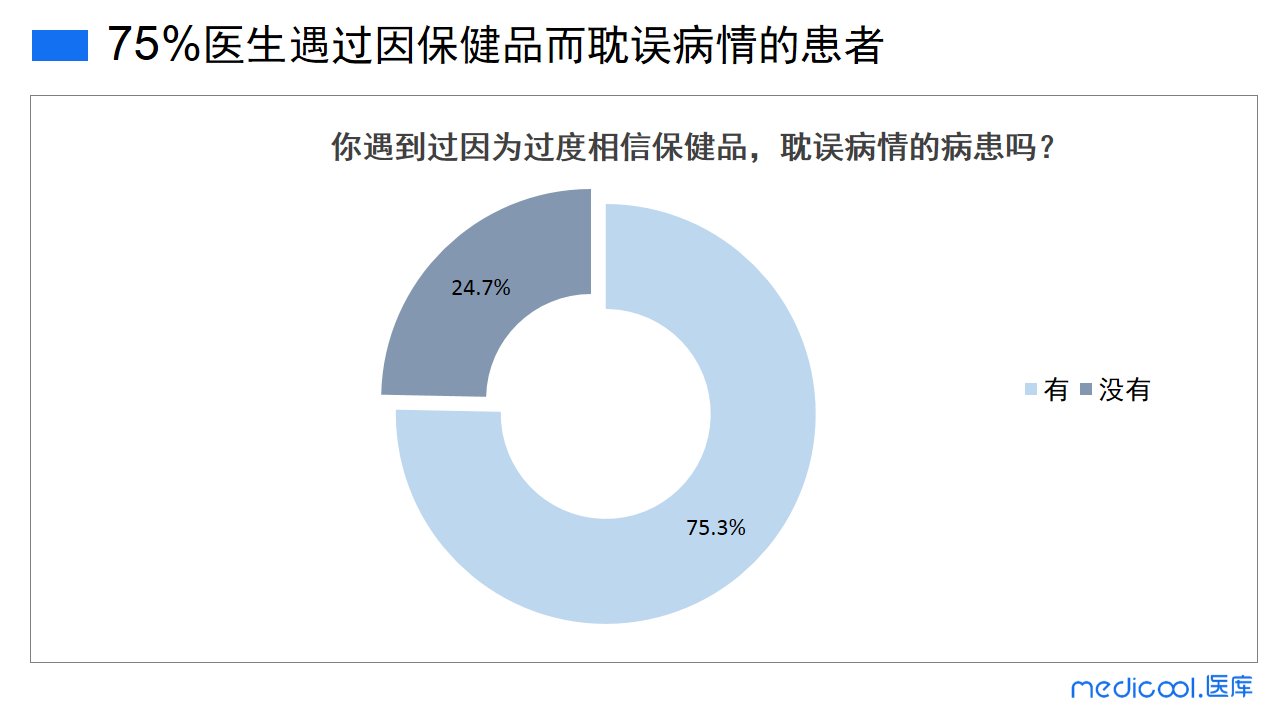 从调研数据来看,超过3/4的医务工作者曾经遇到过患者因为过度相信保健品而耽误病情的。由此可见轻信保健品的疗效并形成依赖是很多病患会出现的情况。