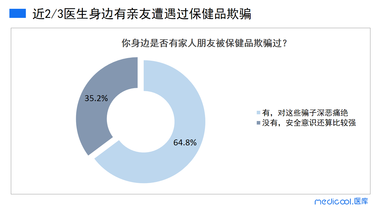 身为一名医务工作者,家里的亲朋好友在有着医疗科普知识熏陶的环境下,对无良保健品的防范意识会不会更强呢?从调查中我们发现这两者并没有很大关联,64.8%医生的家人朋友曾经有遭遇过保健品欺骗。