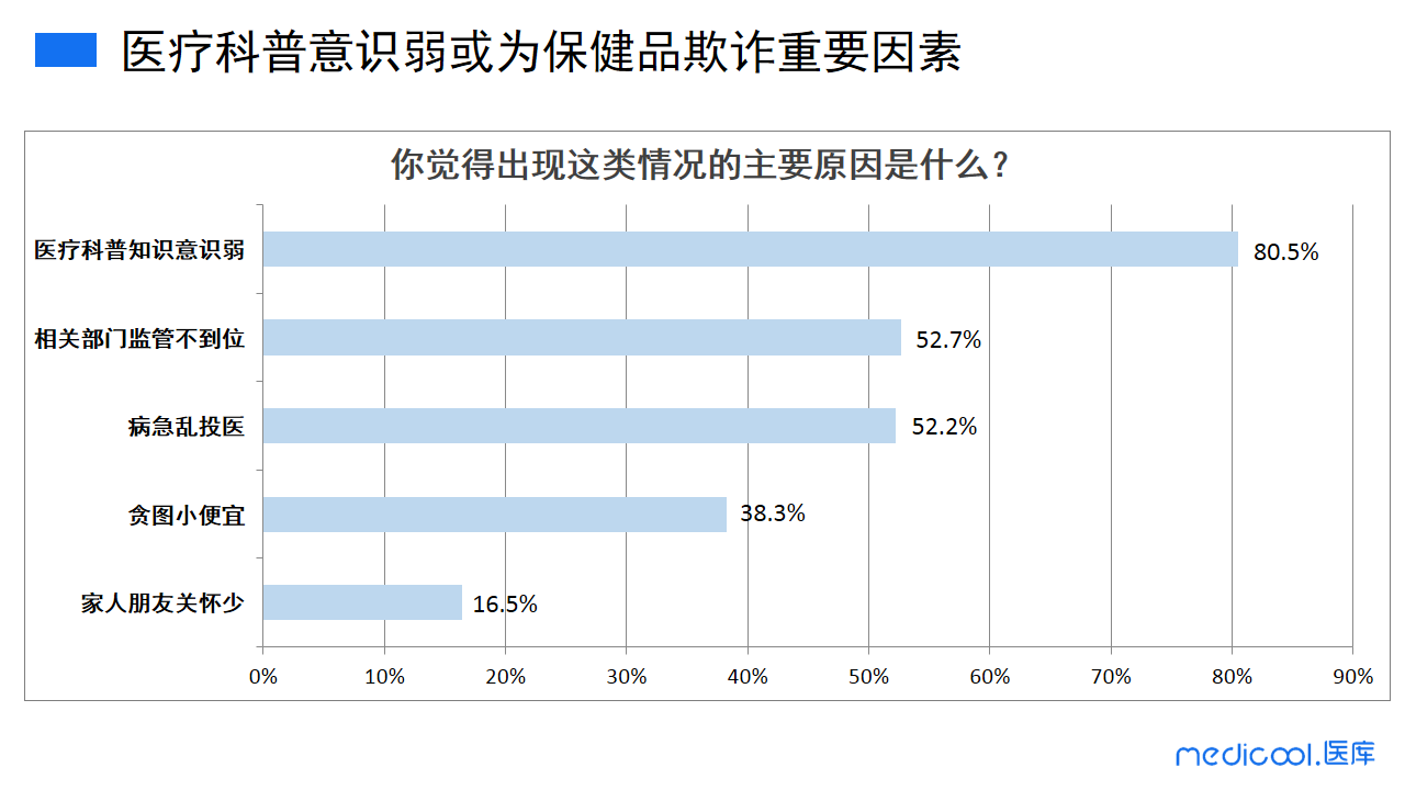 对于病患过度依赖保健品,将药品以保健品取而代之,医生们认为最主要的原因是大众的医疗科普知识意识弱。有超过五成的医生表示,相关部门监管不到位和患者病急乱投医也是很重要的原因,而38.3%的人则认为大家是为了贪图小便宜才会出现这种情况,16.5%的人认为家人朋友获得的关怀少也是一个重要因素。