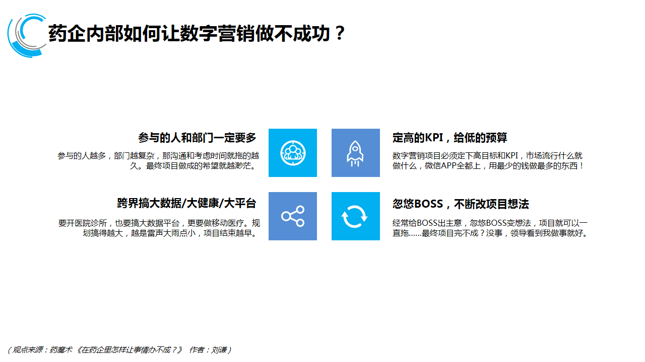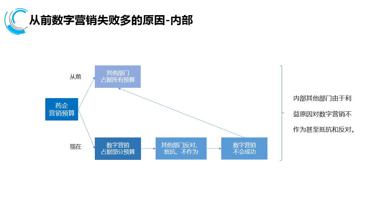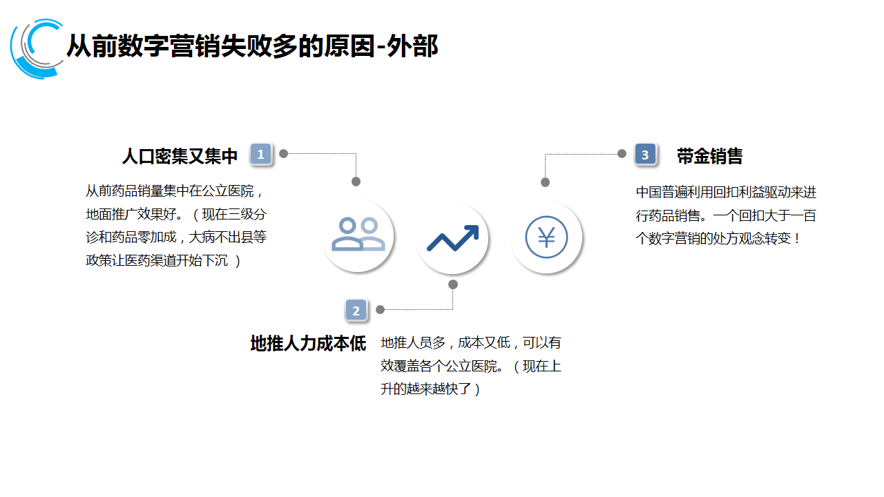 在之前很长一段时间内国内药企数字营销失败案例多,成功的比较少,原因是多方面的。有医生端社区实际渗透率不足、药企内部PK与不作为,带金销售普遍以及各种综合因素等等。