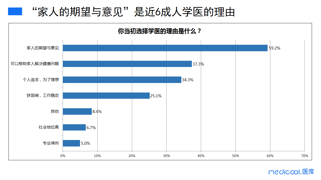 从我们的调查数据中可以发现,近六成的医务工作者选择学医的重要原因是家人的期望与意见。