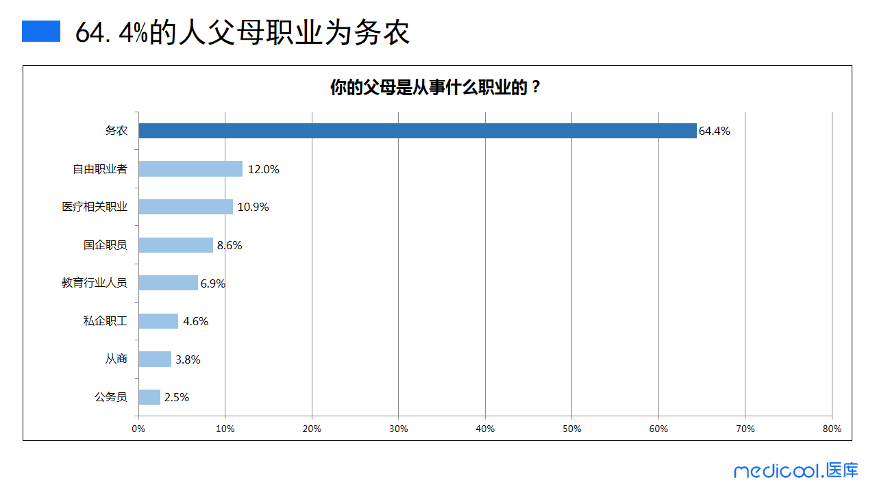 我们可以发现,64.4%的医务工作者父母的职业是务农,其次是自由职业者,只有10.9%的医务工作者的父母是医疗相关职业。