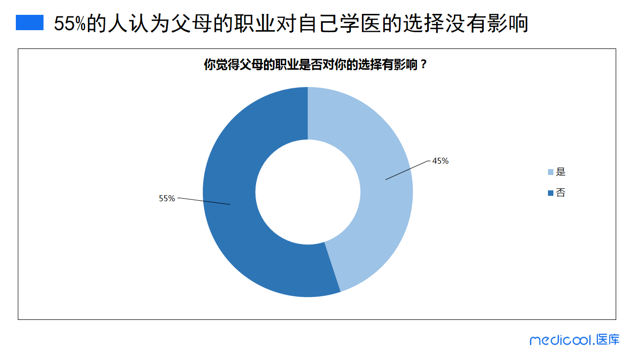 55%的医务工作者表示父母的职业对自己学医的选择并没有影响,剩下的45%的人认为有影响。