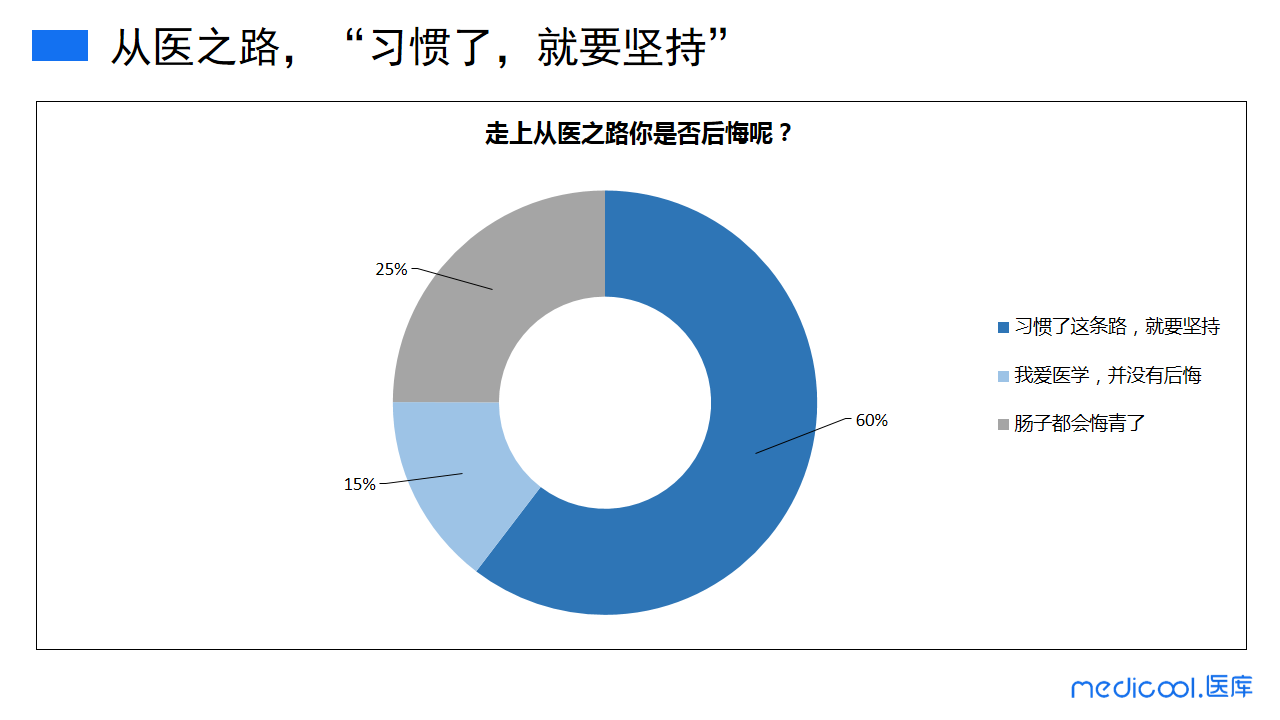 走上从医之路后,六成的医务工作者表示已经习惯了这条路,会坚持下去;其中15%的人表达了对医学的喜爱,并没有后悔学医;还有25%的人觉得肠子都要悔青了。