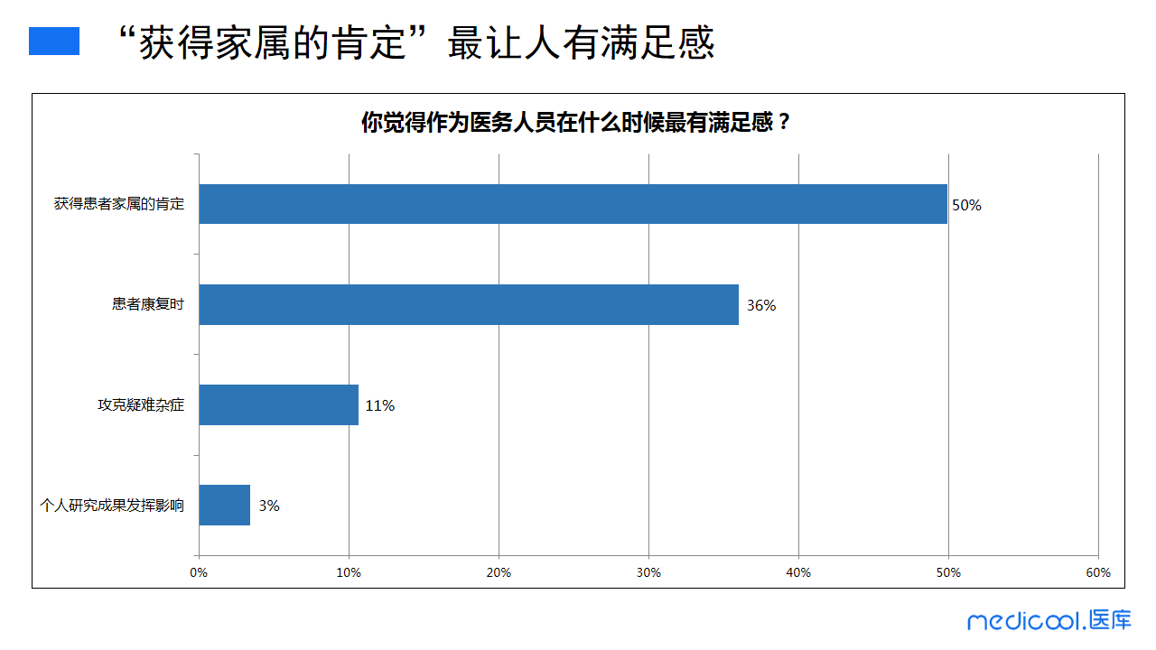 最让医务工作者获得满足感的是可以获得家属的肯定,而患者的康复也是让他们很有满足感的,小部分医务人员会在攻克疑难杂症和个人研究成果发挥影响时获得满足感。