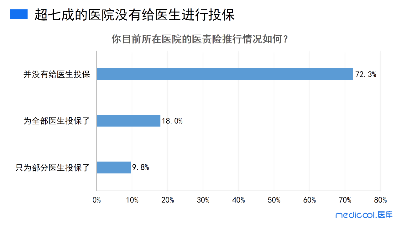 尽管国家一直在推进医责险的投保和普及,但72.3%的医院并没有给医生投保,而为全部医生投保的医院仅占18%,还有9.8%的医院只为部分医生投保了。