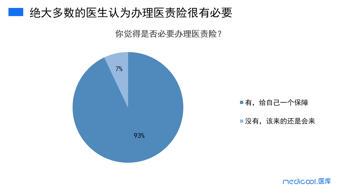 虽然超七成的医院没有给医生进行投保,但93%的医生认为办理医责险很有必要。其中,仅7%的医生认为没有必要办理医责险,该承担的医疗风险还是要承担。