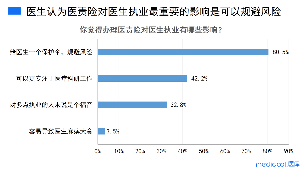 调研显示,医生认为医责险对医生最重要的影响是可以规避风险,其次医责险也可以让医生专注于医疗科研工作,且对于多点执业的人来说是个福音。极少数医生认为医责险容易导致医生麻痹大意。