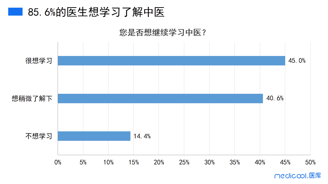 我们可以发现,医生对学习中医呈现出积极的态度,其中有85.6%的医生表示想要学习了解中医,不想学习中医的仅占14.4%。