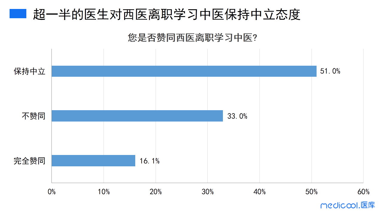 西医正确认识、了解和掌握中医为其工作打下更好的基础。超过一半的执业医师对于国家鼓励西医离职学习中西的举措保持中立的态度,完全赞同的医生占16.1%,还有33%的医生不赞同西医离职学习中医。