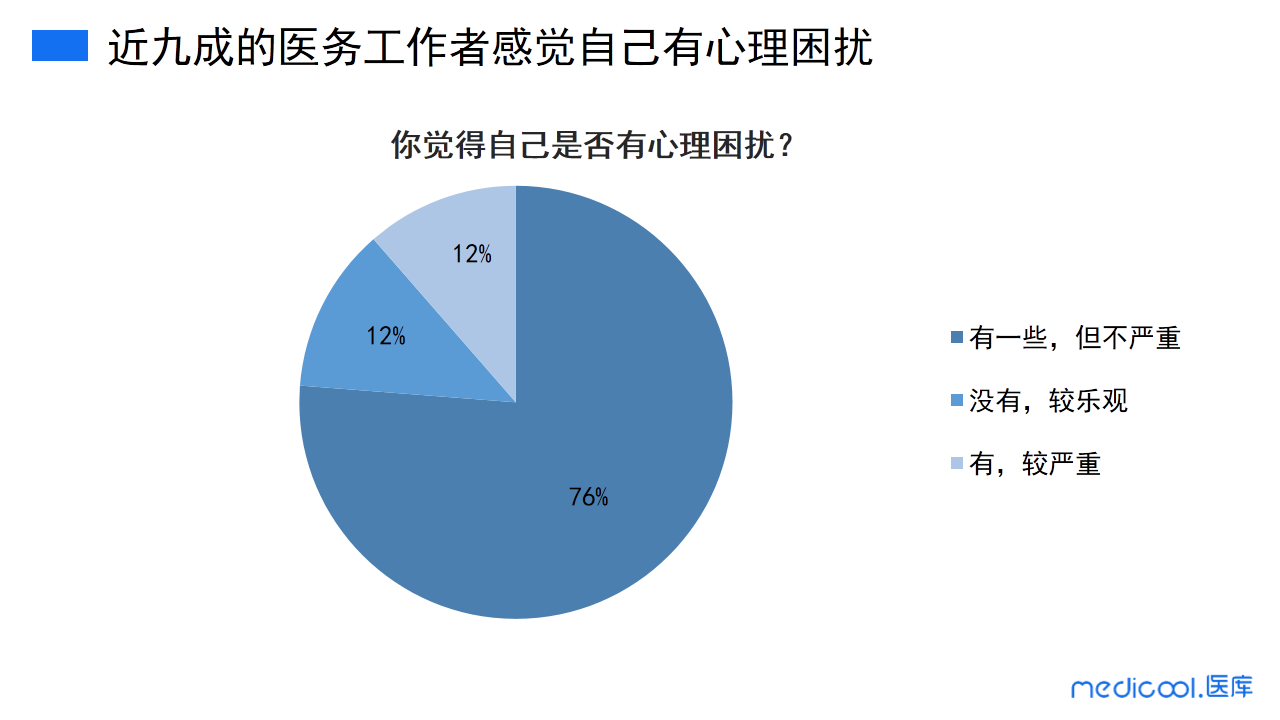 由调研数据可以看出,76%的医务工作者有严重的心理困扰;12%的医务工作者有一些心理困扰,但不严重;12%的医务工作者表示没有心理困扰,很乐观。