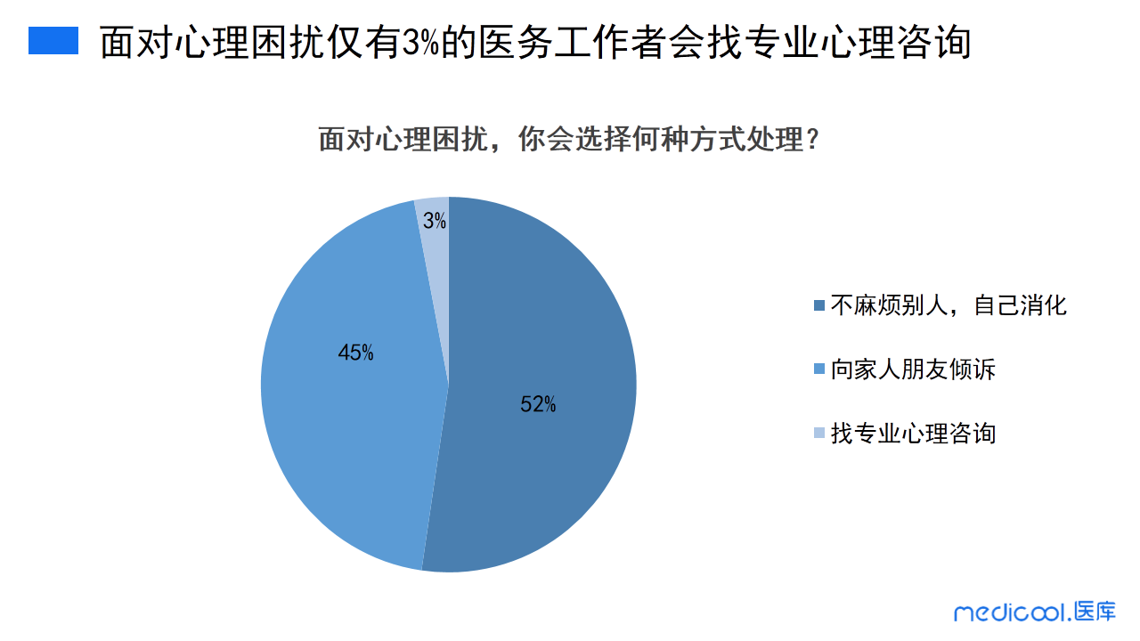 这次调研中,53%的医务工作者会选择不麻烦别人,自己消化心理困扰;45%的医务工作者选择向家人或者朋友倾诉自己的心理问题;仅有3%的医务工作者会选择找专业的心理咨询解决心理困扰。