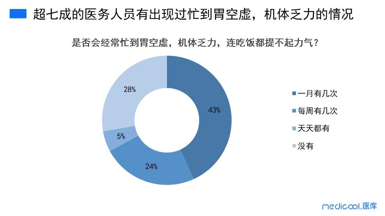 由调研数据可以看出,43%的医务人员一个月总有几次经常忙到胃空空,机体乏力;24%的医务人员每周都有几次很忙,饿得胃空虚,连吃饭都提不起力气;5%的医务人员天天都很忙,每天都感觉胃空空,身体乏力。