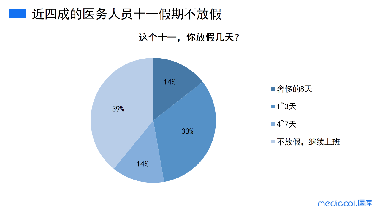 此次调研数据显示,33%的医务人员十一放假1~3天;14%的医务人员十一会放假4~7天;39%的医务人员十一是不放假的,会继续上班;仅有14%的医务人员长假是完全不用上班,可以休息8天。
