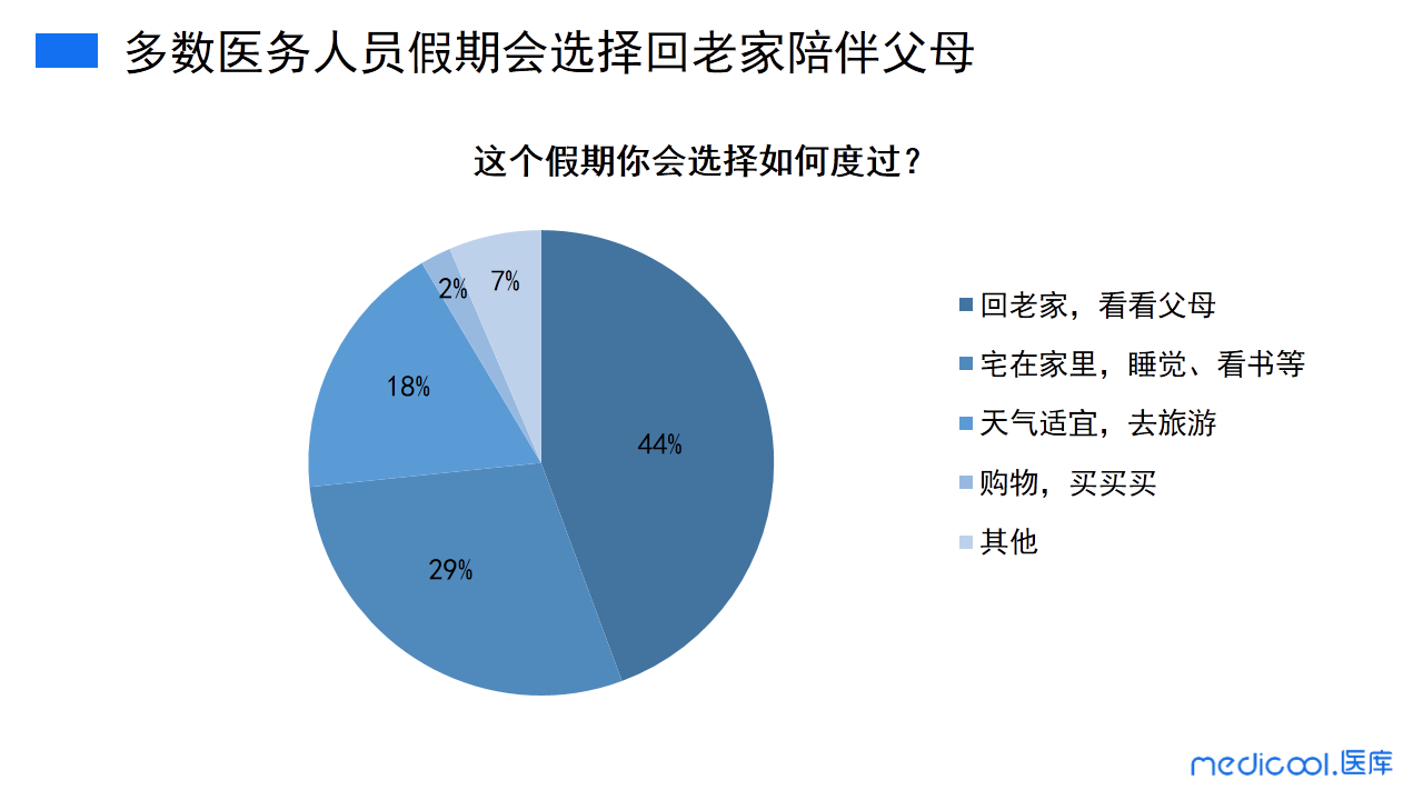 从调研数据可以看出,44%的医务人员会选择回老家看看父母来度过十一假期;29%的医务人员选择宅在家中,睡睡觉、看看书等来过十一假期;18%的医务人员利用这难得的十一假期出去旅游;仅有2%的医务人员选择去购物;还有7%的医务人员选择其他的方式度过自己的十一假期。